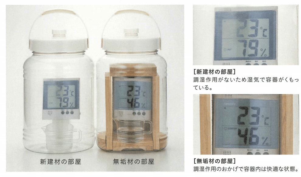先程の実験で、なぜ無垢材の部屋は湿度を調整できたのか?