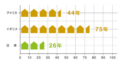 このグラフから分かるように、日本の住宅の平均建て替え年数は他国と比べると短いことが分かります。原因としては、日本の気候風土に合わない工法や、耐久性の低い材料が使われた住宅が多いということがあげられていますが、世界最古の木造建築「法隆寺」はなんと約1300年の歴史があります。侘蔵では伝統の木造建築を研究し、その技術を郷の家に活かしています。